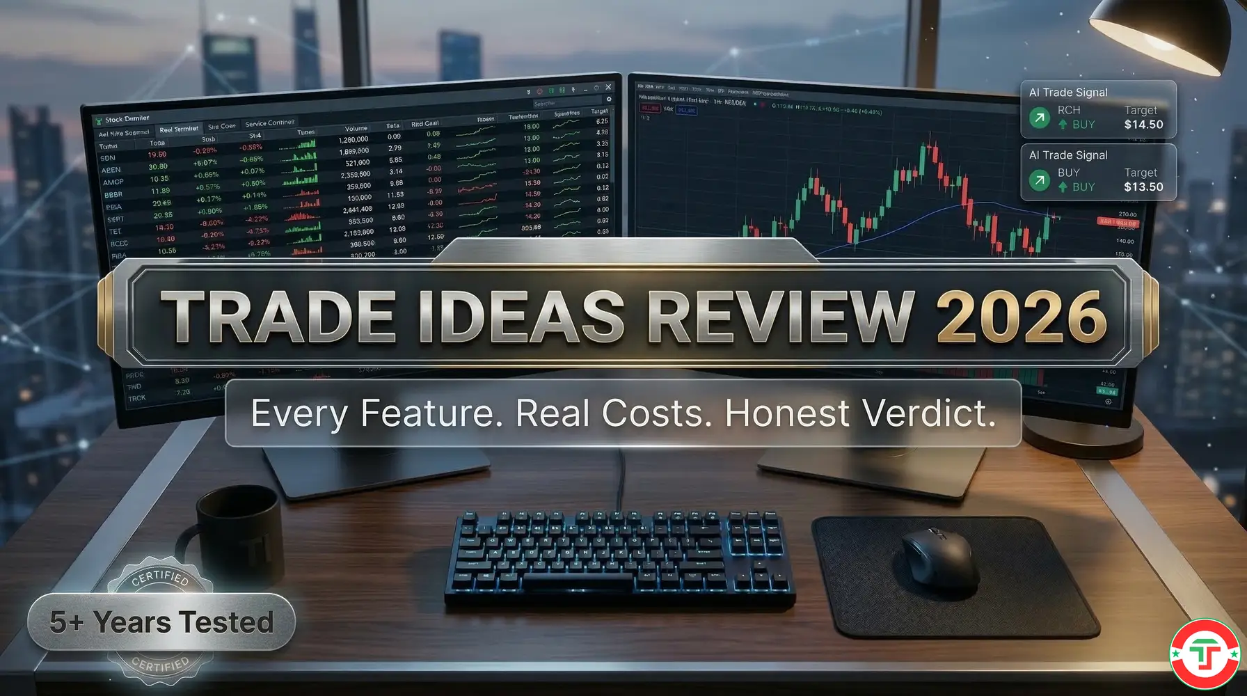 Trade Ideas Review 2026 featured image showing professional trading desk with multiple monitors displaying stock scanners, AI signals, and candlestick charts