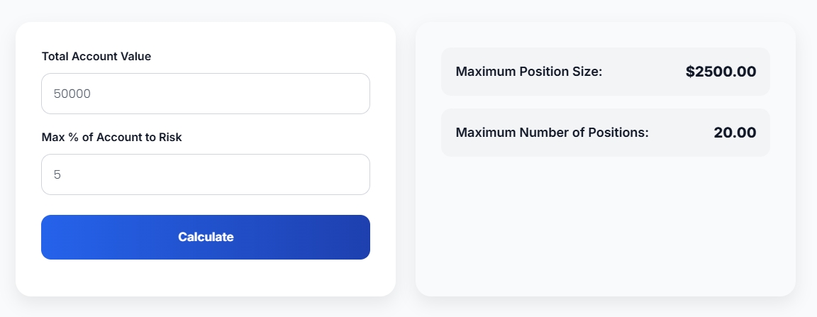 An example of a position size calculator where the 'Total Account Value' is $10,000 and the 'Max % of Account to Risk' is 2%. The calculated result shows a 'Maximum Position Size' of $200.00 and a 'Maximum Number of Positions' of 50.